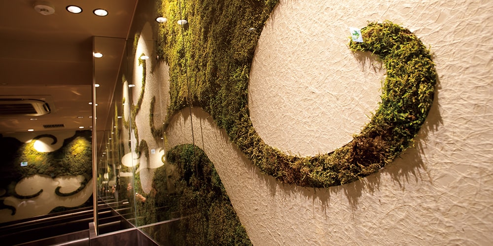店舗が地階にあることから閉鎖感を感じさせ無いよう緑(=苔)を壁面に用い、京都の『苔寺』のように静寂な中に和みや癒しを感じられるような店舗となっております。